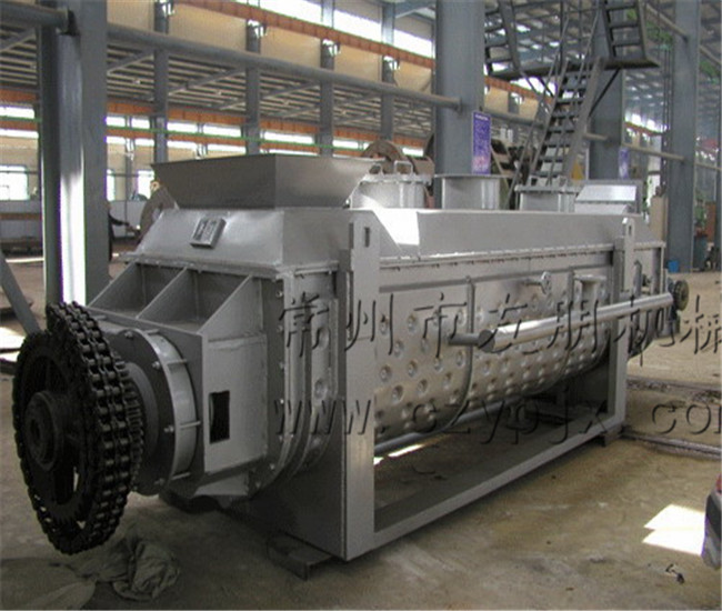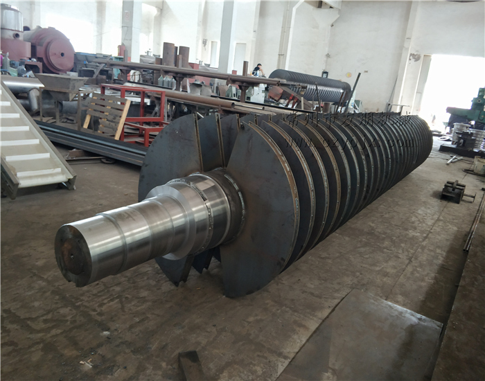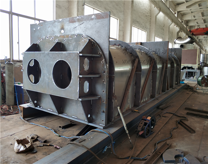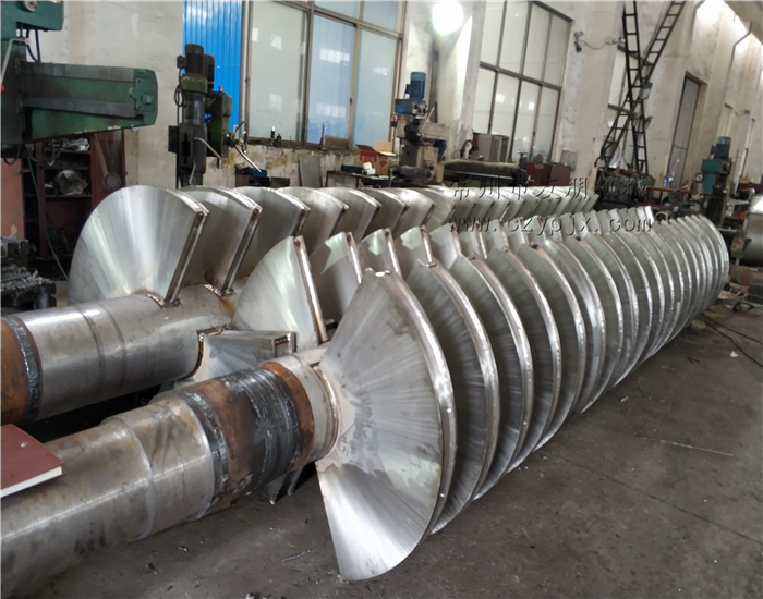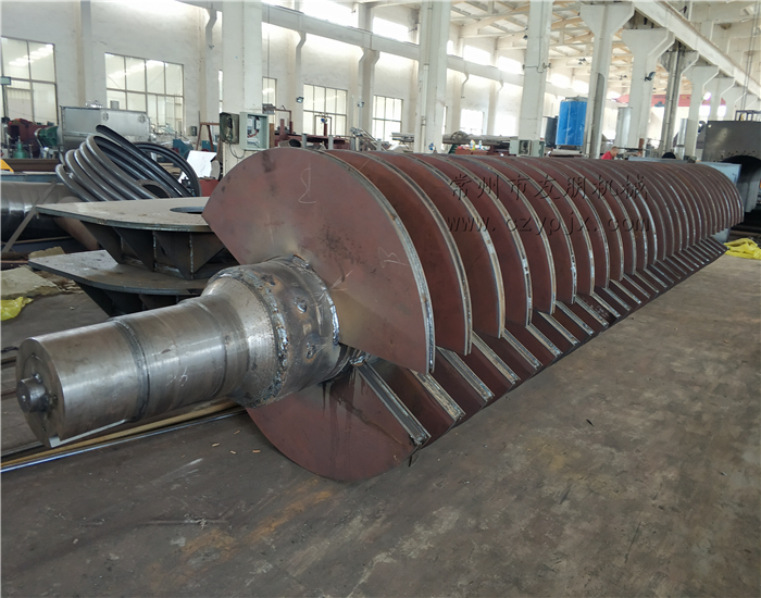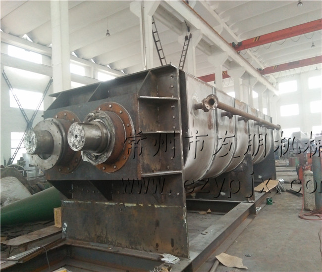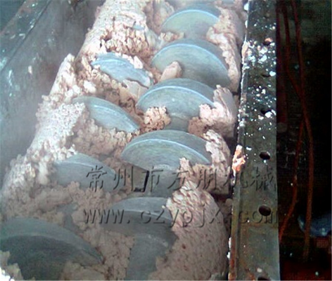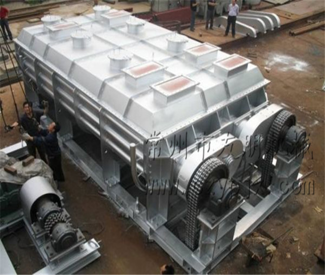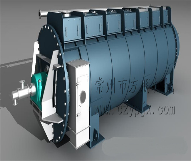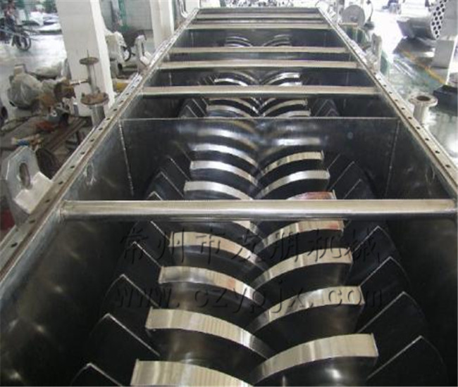 空心軸上密集排列著楔型中空漿葉,熱介質(zhì)經(jīng)空心軸流經(jīng)漿葉。單位有效容積內(nèi)傳熱面積很大,熱介質(zhì)溫度從-40℃到320℃,可以是水蒸汽,也可以是液體型:如熱水、導(dǎo)熱油等。間接傳導(dǎo)加熱,沒有攜帶空氣帶走熱量,熱量均用來加熱物料。熱量損失僅為通過器體保溫層向環(huán)境的散熱。楔型漿葉傳熱面具有自清潔功能。物料顆粒與楔型面的相對運(yùn)動(dòng)產(chǎn)生洗刷作用,能夠洗刷掉楔型面上附著物料,使運(yùn)轉(zhuǎn)中一直保持著清潔的傳熱面。漿葉干燥機(jī)的殼體為Ω型,殼體內(nèi)一般安排二到四根空心攪拌軸。殼體有密封端蓋與上蓋,防止物料粉塵外泄而充分發(fā)揮作用。